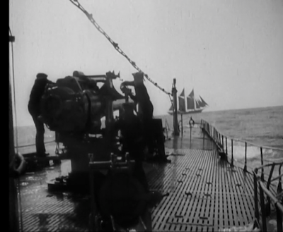George O'Brien's understated authority as the commander keeps the picture from going full cartoon, as does its evenhanded attitude toward the enemy. The film benefits throughout from nice location photography and camerawork from ace cinematographer Joseph August. Toward the end, Ford develops some nice tension as the mystery ship takes a beating from the sub's guns without responding -- we're told the Germans prefer to use guns instead of torpedoes on small-fry like this -- in order to lure the skeptical German captain into the trap O'Brien and his own submarine colleague have set. It ends rather abruptly once the worm turns, and if anything Ford overcommits to reconciliation by sparing the main Germans and teasing further romance in the future. But overall Seas Beneath is a fascinating piece of work from that moment when war could be treated without propaganda, well after the imperatives of World War I and before the imperatives of World War II.